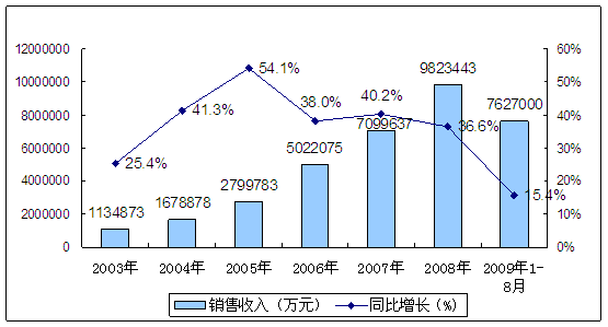 2003年-2009年8月我国食品、饲料添加剂销售收入及增长