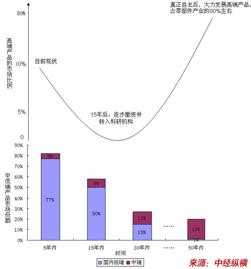 最后形成的发展蓝图就是:高端产品经过厚积后迸发,成为主导产品,剩余的市场份额是中端产品,而低端的产品向其他不发达地区和国家转移。具体 规划 可以用下图表示: