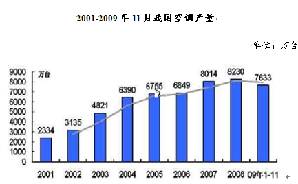 来自国家统计局的消息显示,2009年1-11月份,全国空调产量为7632.95万台,同比下降6.4%,12月家用空调产量557.1万台,环比增加11.46%。空调内销增速继续保持了高位,2009年全年空调销量达到3745万台,同比增长25.8%。