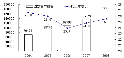 2004-2008年国内固定资产投资及其增长速度 单位:亿元、%