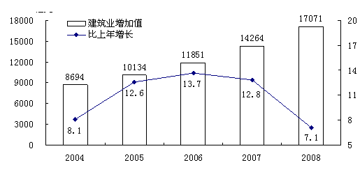 2008年全年全社会建筑业实现增加值17071亿元,比上年增长7.1%。全国具有资质等级的总承包和专业承包建筑业企业实现利润1756亿元,增长12.5%,其中国有及国有控股企业509亿元,增长21.8%;上缴税金2058亿元,增长20.0%,其中国有及国有控股企业771亿元,增长24.7%。