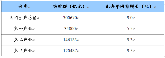 初步核算,2008年全年国内生产总值300670亿元,比上年增长9.0%。分季度看,一季度增长10.6%,二季度增长10.1%,三季度增长9.0%,四季度增长6.8%。分产业看,第一产业增加值34000亿元,增长5.5%;第二产业增加值146183亿元,增长9.3%;第三产业增加值120487亿元,增长9.5%。