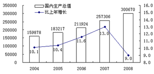 2004-2008年国内生产总值及其增长速度 单位:亿元、%