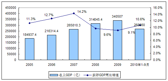 由上图可知,近年来我国国内生产总值(GDP)一直保持高速增长,增长幅度均超过了9%。虽然受世界性经济危机的影响,我国2008和2009年的GDP增长幅度有所下降,但2010年的前2个季度的经济增长幅度出现回升。