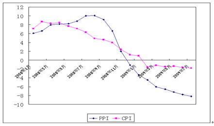 2009年上半年,居民消费价格同比下降1.1%,其中6月份同比下降1.7%,环比下降0.5%;工业品出厂价格同比下降5.9%,6月份同比下降7.8%。自今年2月份以来,CPI和PPI双双步入负区间运行,PPI降幅逐月下探,屡创新低,6月份CPI更创十年新低。6月份CPI、PPI数据均不太乐观,最主要的是环比也出现下降,市场普遍预期的“通胀”短期内难以出现,“通缩”风险并没有消除,而且有可能还在恶化。