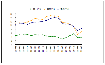 上半年,规模以上工业增加值同比增长7.0%,增速比上年同期回落9.3个百分点。其中,一季度增长5.1%,二季度增长9.1%。在39个大类 行业 中,36个 行业 保持同比增长。高技术制造业增速明显加快,而高载能 行业 生产低位回升,其中包括有色、建材、化工、石油加工业。分轻重工业来看,重工业增长6.6%,轻工业增长8.2%。在全球金融危机的重创之下,重工业增速严重下滑,较轻工业增速发生逆转。然而5月份之后,重工业增速出现较为强劲的反弹势头,从而使得二季度的增速较一季度有了明显的提升。