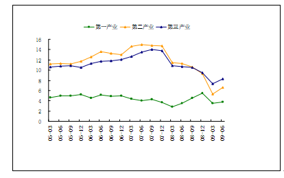 2009年1-6月,国内生产总值139862亿元,同比增长7.1%。其中,一季度增长6.1%,二季度增长7.9%。分产业看,第一产业增加值12025亿元,增长3.8%;第二产业增加值70070亿元,增长6.6%;第三产业增加值57767亿元,增长8.3%。