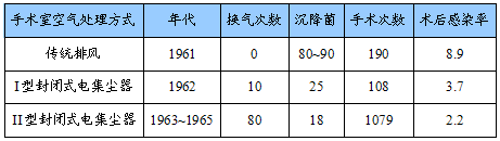 1966年,在美国,由于采用了洁净手术室,费城坦普尔大学保健科学中心的术后感染率由1956年的5%降低到1967年的0.5%。英国威根市赖廷顿医院著名整形外科医生查恩利从1966年开始垂直平行流洁净手术室,他积累了从1959年到1970年的5000多例人工股关节置换手术实例的资料显示:由于使用了垂直平行流洁净手术室,感染率从8.9%降低到0.5%,从而证明了洁净手术室减少手术感染率的高效性。见下表: