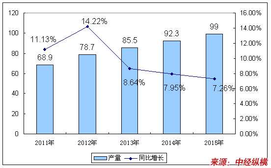 通过2003年-2010年国内耐磨钢产量预测未来五年我国耐磨钢产量增长率逐年下降,这主要原因在于国内耐磨钢逐步从发展期进入成熟期,产品产量呈稳定增长。