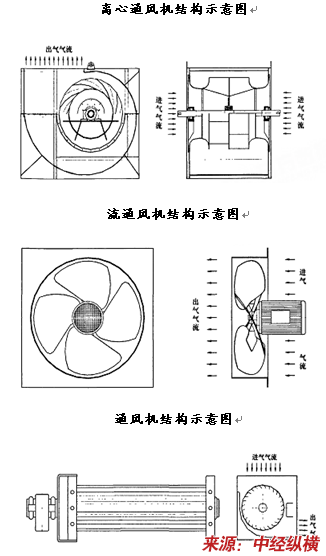 气流在叶轮中沿着半径方向流动的通风机为离心通风机。气流在旋转叶片的流道中沿着轴线方向流动的通风机为轴流通风机。气流沿着多叶叶轮半径方向从叶轮的一侧进入并穿过叶轮,从叶轮的另一侧流出的通风机为横流通风机,也称作贯流式通风机。