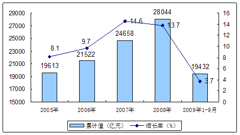 初步测算,2009年全年国内生产总值335353亿元,按可比价格计算,比上年增长8.7%,增速比上年回落0.9个百分点。