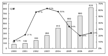 中国LED市场持续扩大,于2006年达到了146亿元。1997~2006年的年平均增长率高达29%。支撑中国LED 市场发展 的是名为高亮度LED的品种。该品种在2002~2006年的年平均增长率更高,达到35%,2006年高亮度LED市场的规模为90亿元。高亮度LED中,有40%的应用途径为背照灯光源。