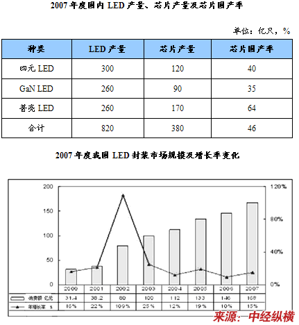 2008年我国LED封装产值达到185亿元,较2007年的168亿元增长10%;产量则由2007年的820亿只增加15%,达到940亿只,其中高亮LED产值达到140亿元,占LED总销售额的76%。同时从产品和企业结构来看国内也有较大改善,SMD和大功率LED封装增长较快。2008年台湾LED产值为609亿新台币,比起2007年,成长率达13%。其中,手机与导航装置是主要应用,约占所有应用的29%。