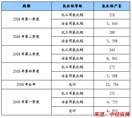 蓝宝石晶体是氧化铝(Al2O3)最基本的单晶形态。我国具有较丰富的铝土矿资源,迄今已探明保守储量位居世界第4,具备发展氧化铝工业的资源条件。我国氧化铝2008年及2009年一季度的产量情况如下: