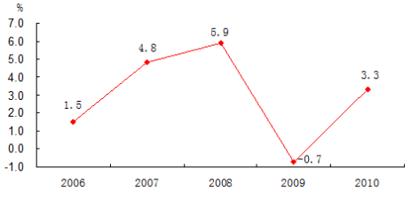 初步核算,2010全年中国国内生产总值397983亿元,比上年增长10.3%。其中,第一产业增加值40497亿元,增长4.3%;第二产业增加值186481亿元,增长12.2%;第三产业增加值171005亿元,增长9.5%。第一产业增加值占国内生产总值的比重为10.2%,第二产业增加值比重为46.8%,第三产业增加值比重为43.0%。