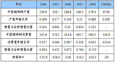 2009年全球铜消费难以出现回升态势,预计同比萎缩10%左右。我们对全球铜市维持过剩格局的判断,而且全年过剩压力可能较2008年更为严重。但随着全球经济今年年底的逐步复苏,预计过剩压力将主要集中于今年二、三季度,第四季度可能有所改善。预计中国2009年将生产395万吨铜,较2008年的374万吨增加将近6%。预估2010年铜需求或增至565万吨,产量将增至420万吨,净进口量为160万吨,导致市场过剩150,000吨。