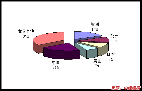中国、智利、日本、美国和西欧为全球主要的精炼铜生产国/地区。世界精炼铜产量连续增长6年后,受2008年铜价下跌以及部分矿山主产区品位下降等因素影响,今年一季度产量环比、同比均出现下滑。中国于2006年超越智利成为最大的精炼铜生产国,近几年来一直维持较高的产量及产量增速。2008年中国精炼铜产量为380万吨,占全球精炼铜总产量比重达21%。