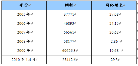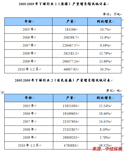 2010年1~4月,全国十种有色金属产量1008万吨,同比增长35.9%,2009年同期为下降6.5%。电解铝产量537万吨,增长51.3%,2009年同期为下降15.2%;铜产量增长16%,增速同比加快9.3个百分点;铅产量增长4.5%,减缓19.2个百分点;锌产量增长34.7%,2009年同期为下降2%。氧化铝产量增长52.7%,2009年同期为下降6.7%。