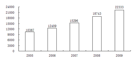 2005-2009年我国建筑业增加值情况 单位:亿元