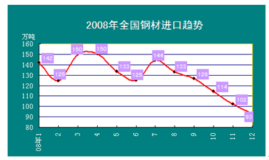 2008年12月份我国进口钢材93万吨,较11月份下降9.7%,与2007年12月相比下降30.33%;钢材进口持续6年下降,2008年全年累计进口钢材1543万吨,同比下降8.6%。