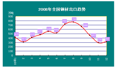 2008年12月份我国出口钢材317万吨,比11月份回升22万吨,与2007年12月份相比下降33.73%。2008年全年累计出口钢材5923万吨,同比下降5.5%;也是2002年以来连续6年增长后的首次下降。
