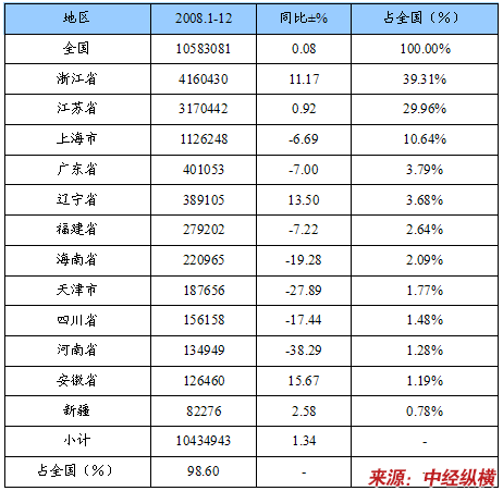 2008年1-12月份,全国PET产量合计为1058.31万吨,比上年同期增加0.08%;其中产量最大的省市是浙江省,产量为416.04万吨,为省市龙头;其次是江苏省,产量317.04万吨,位居亚军。