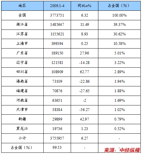 2009年1-4月份全国PET产量合计为377.38万吨,比上年同期增加6.32%;其中产量最大的省市是浙江省,产量为148.56万吨。