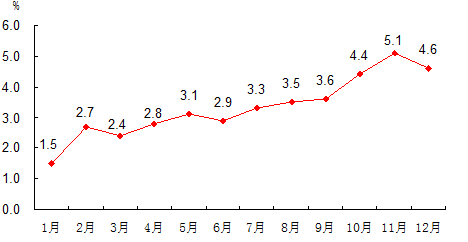 居民消费价格一季度同比上涨2.2%,二季度上涨2.9%,三季度上涨3.5%,四季度上涨4.7%,全年平均比上年上涨3.3%,其中食品价格上涨7.2%。固定资产投资价格上涨3.6%。工业品出厂价格上涨5.5%。原材料、燃料、动力购进价格上涨9.6%。农产品生产价格上涨10.9%。