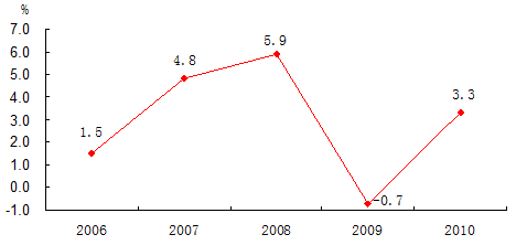 初步核算,2010全年中国国内生产总值397983亿元,比上年增长10.3%。其中,第一产业增加值40497亿元,增长4.3%;第二产业增加值186481亿元,增长12.2%;第三产业增加值171005亿元,增长9.5%。第一产业增加值占国内生产总值的比重为10.2%,第二产业增加值比重为46.8%,第三产业增加值比重为43.0%。