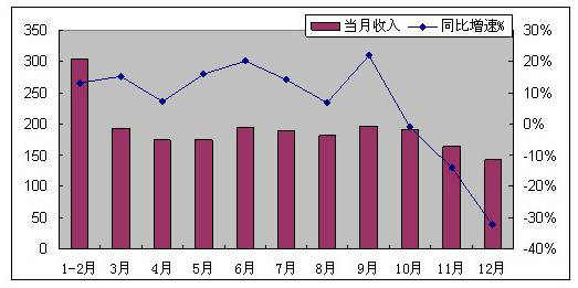 从第四季度开始,受国际金融危机进一步深化的影响,企业定单明显减少,部分企业开工不足,盈利水平大幅下降,亏损企业增多,集成电路 行业 月销售收入额逐月下降,10月当月销售收入下降0.8%,11月降幅进一步提高至14.1%,12月下降32.2%,创下历年来月销售收入增速的新低。