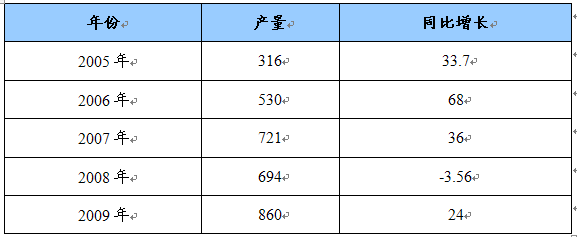 2005-2009年我国不锈钢产量增长情况 单位:万吨,%