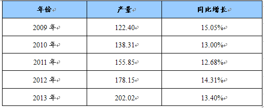 2009-2013年我国山梨醇产量预测表 单位:万吨