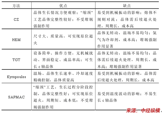 综上所述,蓝宝石晶体的生长方法不仅几乎覆盖了全部的晶体生长技术,而且其中HEM、TGT及SAPMAC等晶体生长方法主要是针对蓝宝石晶体而发明的,均具有各自的独到之处。CZ法以生长3英寸蓝宝石晶体为主,HEM、TGT、Kyropoulos、SAPMAC法以生长4英寸以上圆柱状晶体为主,其晶体生长特点如表所示。