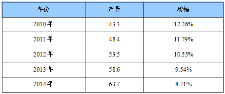 2010-2014年我国甲基丙烯酸甲酯(MMA)产量预测表