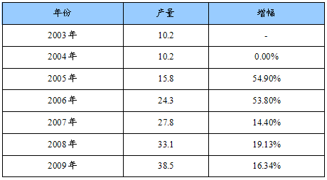 2003-2009年我国甲基丙烯酸甲酯(MMA)产量统计表