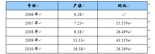 2006-2010年晶闸管产值及同比增长统计表 单位:亿元