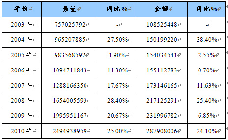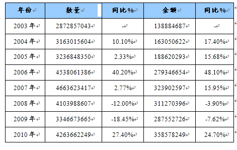 2003年-2010年半导体开关元件等进口情况 单位:个,美元