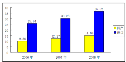 2006-2008 年国内市场国产及进口产品销售额比较 单位:亿元