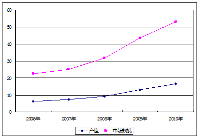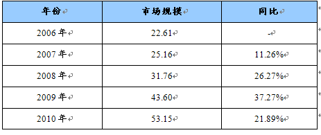 2006-2010年晶闸管市场规模及同比增长统计表 单位:亿元