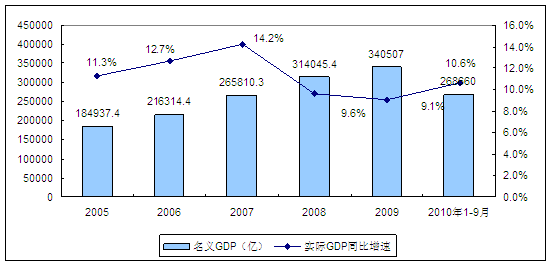 由上图可知,近年来我国国内生产总值(GDP)一直保持高速增长,增长幅度均超过了9%。虽然受世界性经济危机的影响,我国2008和2009年的GDP增长幅度有所下降,但2010年的前2个季度的经济增长幅度出现回升。