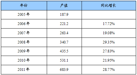 2005-2011年中国建筑智能化设计施工产业总产值计同比增长