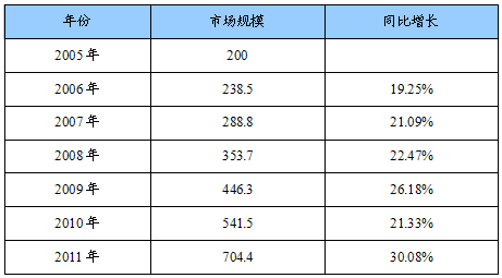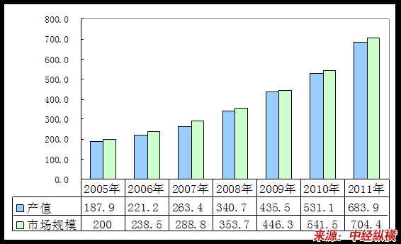 2005-2011年中国建筑智能化设计施工产值、市场规模对比图