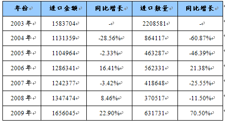 2003-2009年我国磷酸二氢钾进口量值