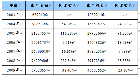 2003-2009年我国磷酸二氢钾出口量值