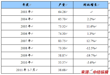 2003-2011年7月中国蜡烛产品产量及同比增长 单位:万吨