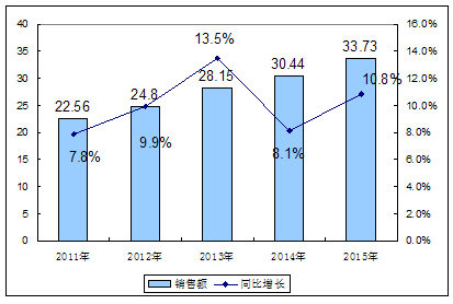 2011-2015年中国市场蜡烛销售额预测 单位:亿元人民币