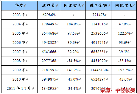 2003-2011年7月各种蜡烛及类似品进口数量及金额表 单位:千克,美元