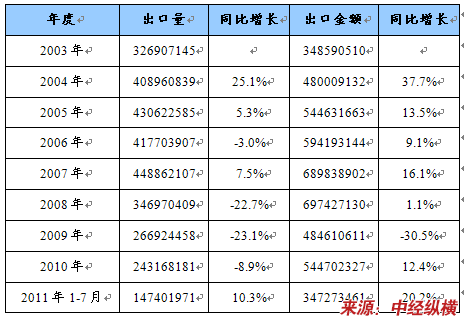 2003-2011年7月各种蜡烛及类似品出口数量及金额表 单位:千克,美元