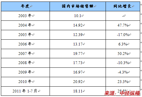 2003-2011年7月中国市场蜡烛销售额及同比增长 单位:亿元人民币