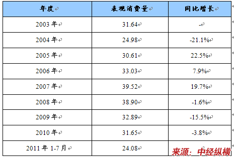 2003-2011年7月中国市场蜡烛表观消费量统计 单位:万吨